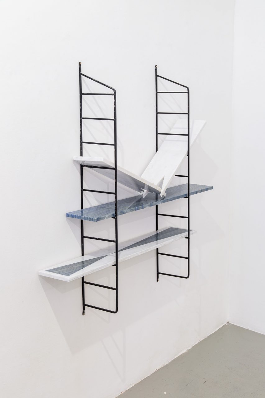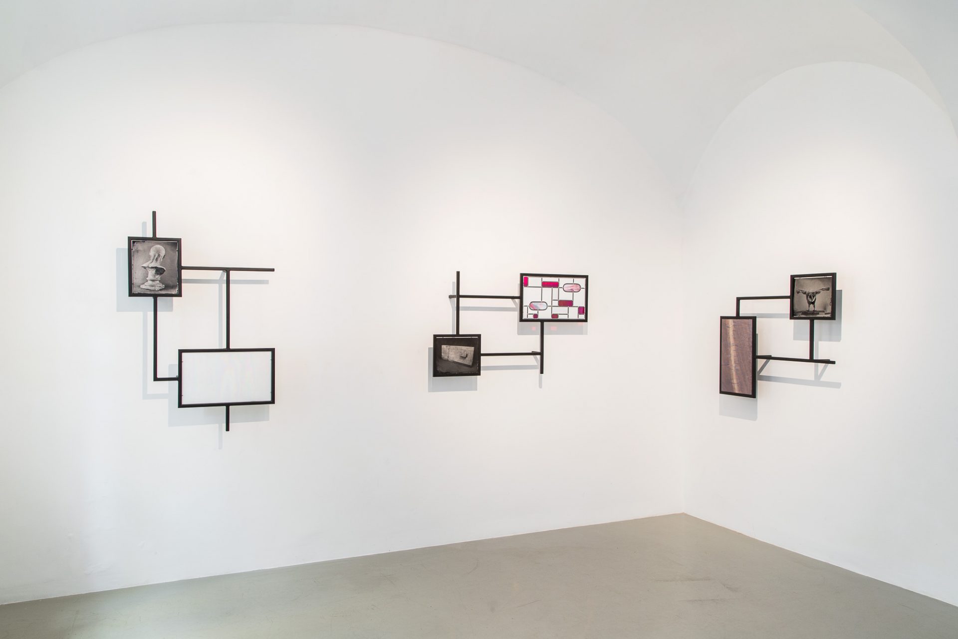 Ádám Albert delved into this wide-ranging cultural, historical and personal subject matter when he began to conduct his own experiments into what could be done with “clever concrete”, transplanting this modernist invention into the fertile grounds of an even broader technological-cum-handicraft tradition. Using the technique of “clever concrete” he recently produced an enormous installation in Paks Picture Gallery (Library of Craftsmanships, 2017), a miniaturised mock-up of which appears in the Kisterem Gallery, standing on one of the items of pseudo furniture constructed of metal frames supporting pairs of plasterboard negatives (Home Sweet Home, 2017). The interior-like ensemble is complemented by a carved marble, faux modernist, broken bookshelf (Flat-Packed Landscape (Horizont), 2016), as well as ambrotypes (collodion positives) of an anatomical muscular model (Plaster Modulor, 2016) and a copper laurel wreath (Victory, 2016). In the second room, Ádám Albert has constructed a “folding screen” out of plaster panels, with part of its surface decorated with a pyramidal pattern (Boudoir, 2017). Some of the 60 x 60 cm “clever concrete” modules used to make the screen have instead been hung on the wall, transubstantiated into “easel works” titled From the series of Non-Existing Mixed Technics (2016–2017). On the walls around the screen, iron structures fitted with colourful stone insets or abstract leaded glass windows bring the exhibition into thematic unity; each of these frames also features an ambrotype inset: one is of a plaster bust facing away from the viewer (SKB, 2017), another shows a study of a distorted wall (Twisted wall, 2017), while the third is a portrait of the stuffed and mounted barn owl (Nightwatch of Anxiety #2, 2017). The closing item, the actual stuffed owl preparing to take flight (Nightwatch of Anxiety #1, 2017), is the metaphorical narrator of the exhibition, observing the diverse set of works from a high vantage point, fully aware that it is through weaving together different techniques, inventions and means of expression, and through embedding them in history, that meaning comes to life, mutates and expires