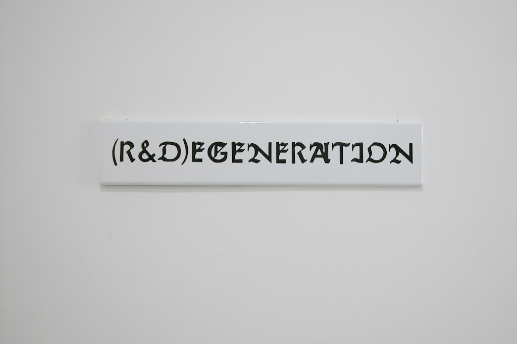 Az ellentétpárok egybeolvasztása jellemzi a kiállításon szereplő többi szöveges munkát is. 2009-ben hozta létre a Société Réaliste a Futura Fraktur betűtípust, mely két létező betűtípus, a modernizmus védjegyeként ismert Futura és a konzervatív, gót írásképként ismert Fraktur keresztezéséből jött létre. A tipográfia-történet nagykönyvének egyik meghatározó fejezetét nyitja az a távirat, mellyel 1941-ben Martin Bormann a Führerre hivatkozva betiltatta a Fraktur betűtípusok használatát. A totalitárius modernizmus fragmentumai: Mein Komfort (40 x 10 cm, zománctábla, 2010), (R&D)egeneration (50 x 10 cm, zománctábla, 2010), 21st Fraktur of Futura (50 x 15 cm, zománctábla, 2009).