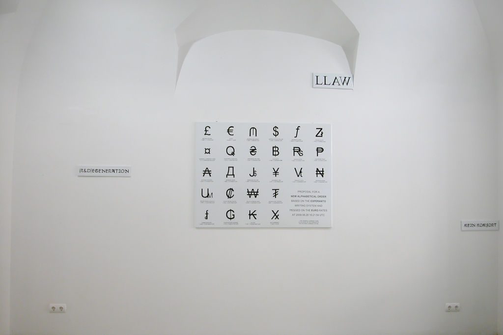 A Société Réaliste által átalakított karakterek, írásrendszerek egy másik példája a New Alphabetical Order (130 x 100 cm, zománctábla, 2010). 2009-ben tervezték meg az Experanto betűkészletet, mely kizárólag deviza-jelekből áll. A New Alphabetical Order egy javaslat egy olyan állandóan változó ábécérendre, ahol az egyes betűk helyzete az aktuális deviza-árfolyamtól függ.