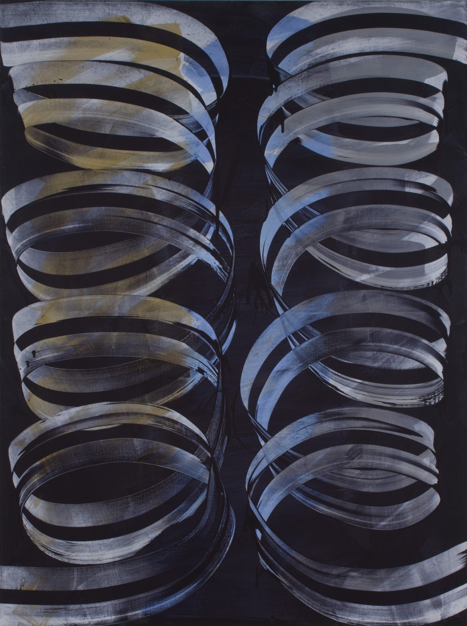 In the 2010s Nádler hit upon a new central motif: the spiral form dominating the centre of metaphysical picture spaces, which, like the biblical pillars of smoke and fire or a whirling vortex cast by the forces of nature, mediates between up and down, within and without, as an imaginary clustering of energy. Nádler’s paintings are governed by the contrast of light and dark, which is overwritten by the illusionistically foreshortening spiral form, suggesting complex spatiality, creating a connection between the mutually counterposing picture fields, planes, and patches of colour.