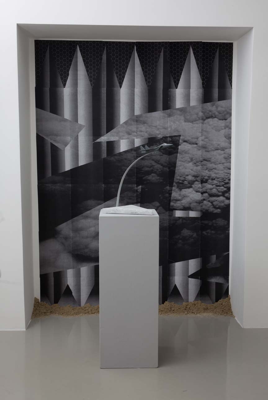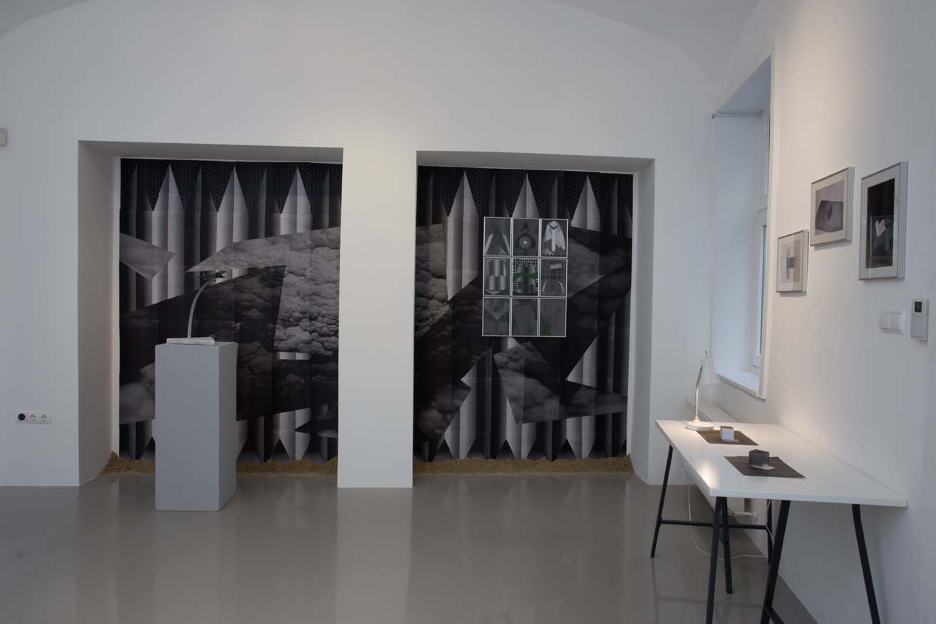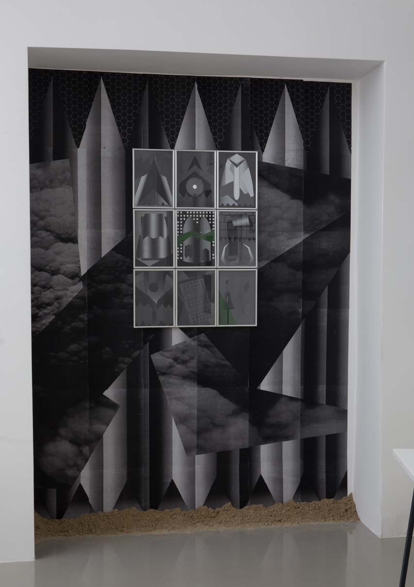 Márk Fridvalszki’s series, collectively titled “Hagere Geometrie”, consists of conceptual collages inspired by 21st-century high-tech military industrial aesthetics and innovation. The most emphatic elements used in the series, which draws from corporate industrial and alienated technocratic design, are arched forms, barbed, metallic shininess, (aero-)dynamic lines, and grey tones that are kept in an apparently neutral state of transition between black and white. Adding a sense of contrast to accompany the lifeless, devitalised hues of grey, there is the occasional geometric green surface, alluding to living and thriving nature. However, making its presence strongly felt as part of the series is an F-15 fighter-bomber aircraft, one of the hi-tech military machines used during NATO’s interventions in the Middle East. In the alcove, papered with a scene of a barren landscape, the silver-framed collages suspended on the wall like an installation of solar panels, together with the statuesque model of the fighter jet, conjure up the impression of the interior of a tycoon’s office, with a view over an apocalyptic desert. The visual language of Fridvalszki’s illusion, which wavers between utopia and reality, recalls the geometry of the boundless futurology of early twentieth-century Constructivism and Suprematism. The same is true for András Zalavári’s laboratory of cube experiments.