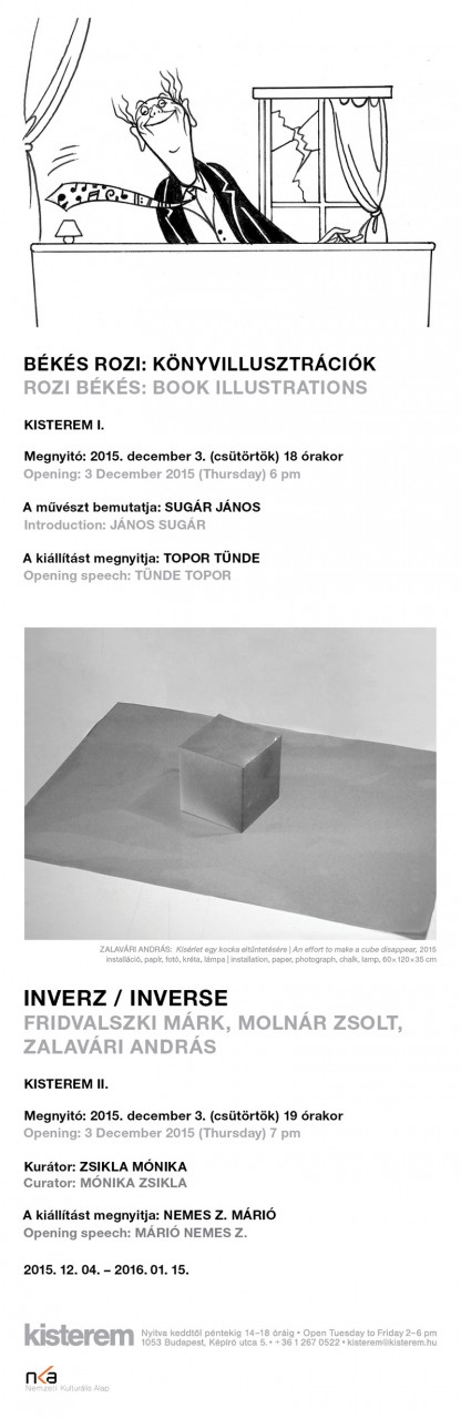 Az INVERZ három olyan művész munkáit mutatja be elsőként a Kisteremben, akik a legfiatalabb generáció tagjaiként a poszt-digitális hozzáállás jegyében alkotják meg redukált képi felületeiket. A kiállított munkák mindegyike inverz módon viszonyul leképezése tárgyához, a választott előkép esztétikájának vizuális nyelvéhez, és a perspektívához.