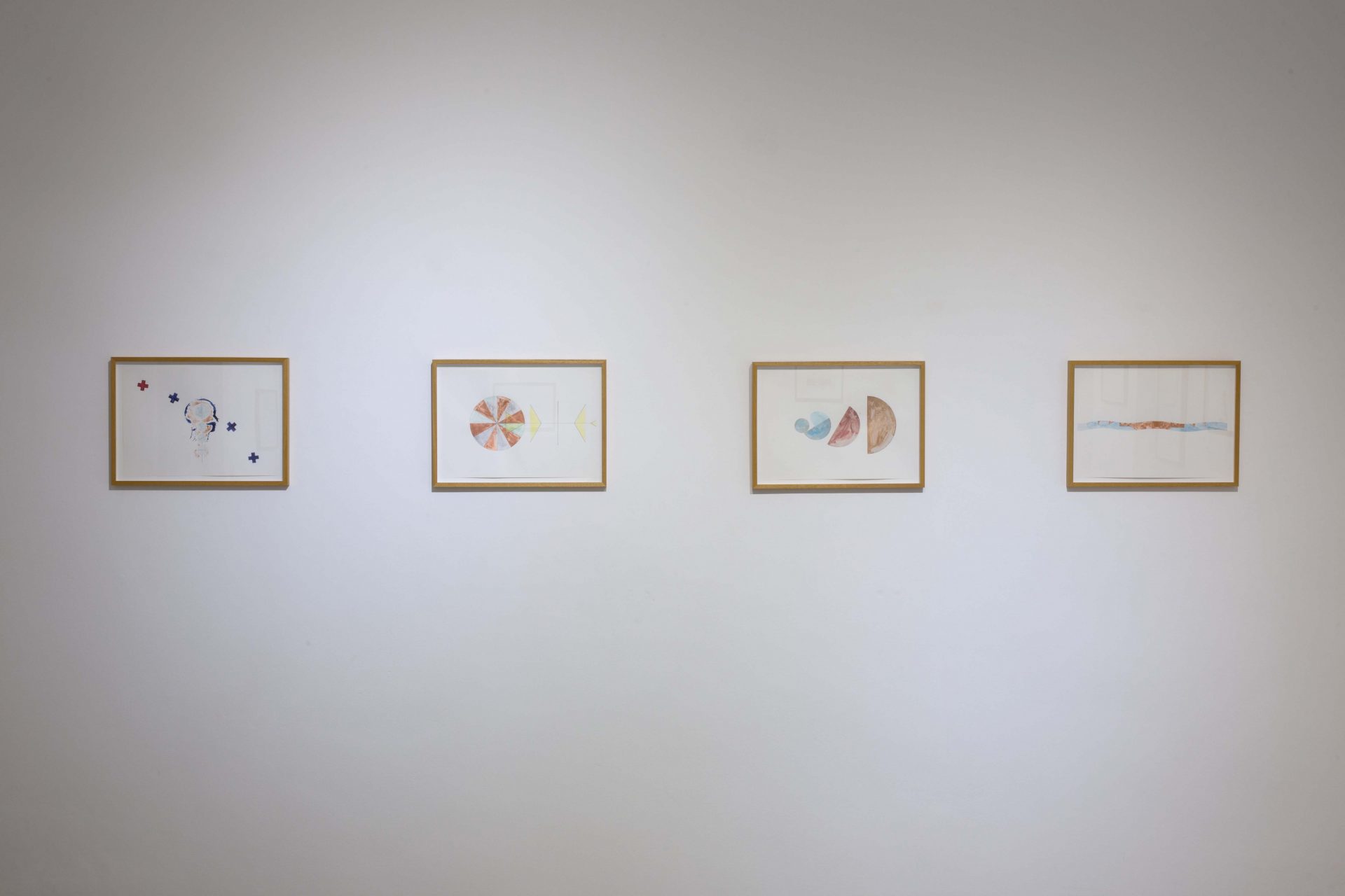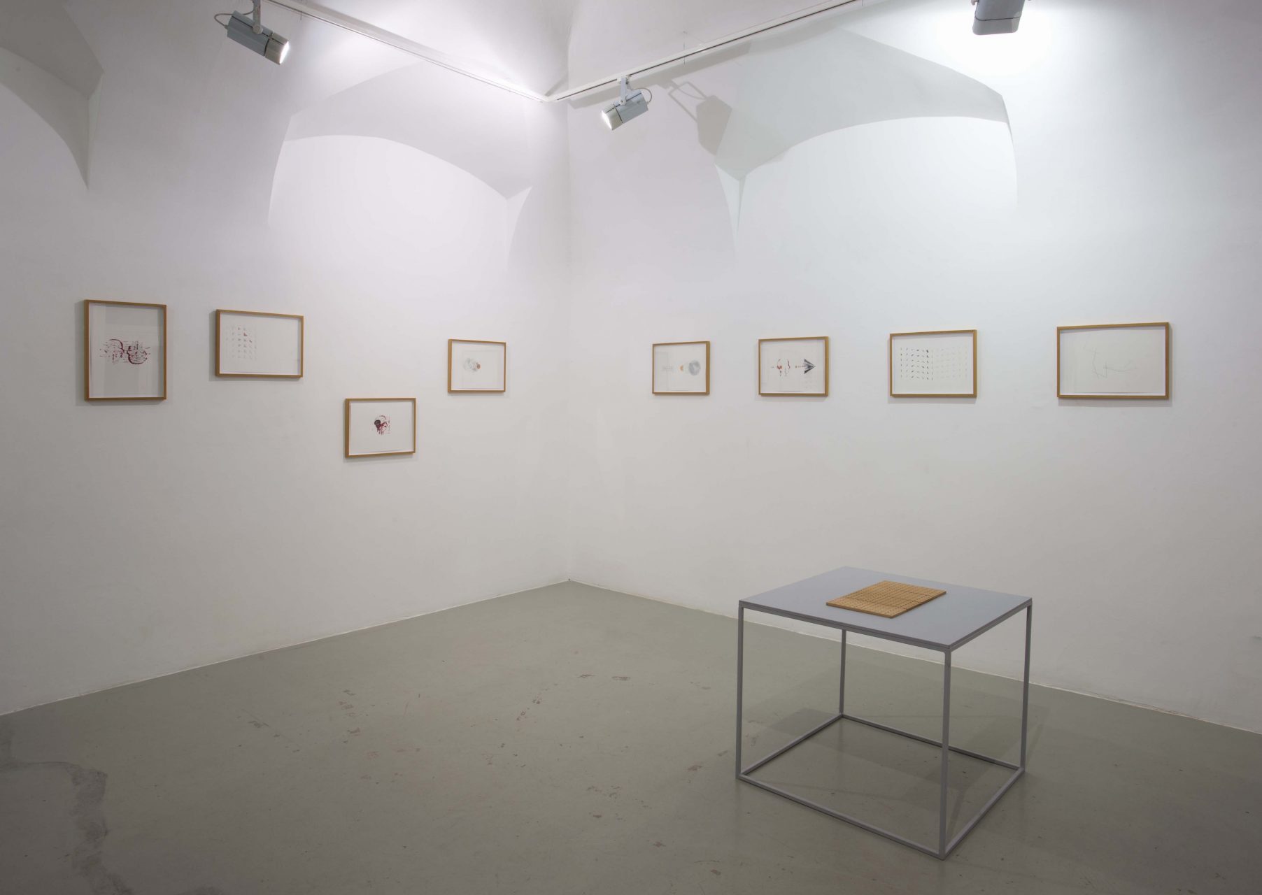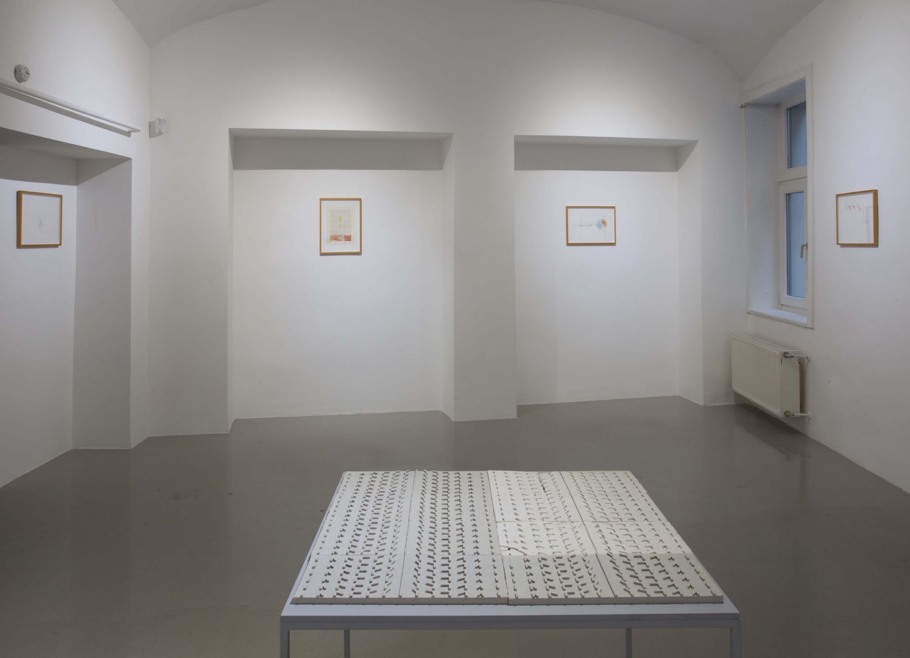 We perceive the passing of time through sequent events. Even if events around us follow each other inevitably, in our minds we can always stay in the past or in the future. But when are we in the present? Can the state of being present be perceived? The relationship of time and perception has been concerning Vécsei for a long time. In her drawing series entitled After Effect (2010) she explores the changing, unpredictable mechanism of remembrance. The material of the present exhibition is the continuation of the Timeline drawings (2016) displayed in Kisterem Gallery’s show Reality Exercises, in which the abstract forms around the horizontal axis refer to the phases of the clock-hand. The picture fields of the Presence series (2018) keep the horizontal axis but in the same time shift in a vertical direction. The clean forms known from earlier graphics – like the orb, the circle or the line – are completed with anatomical sectional drawings. In each drawing the luster-like, gleaming surfaces of Japanese pearlescent watercolor increase the possibility of tilting of the abstract and figural shapes of uncertain state. The horizontal, vertical, and diagonal lines create the reticular system that Vécsei spreads into space through the installations. The monotonous pattern of the wooden, plaster and silicon panels repeat the twelve phases of the clock-hand, advancing on the same track from line to line. The human body moves similarly to the clock-hand around its spine; it approaches the horizontal axis during the night and the vertical during the day. Although the units of the time net are constant, monotony gets broken: the here and there crackled design of the plaster-silicon installation (Fragment) turns from negative into positive, the wood piece’s (One Day) unity of twenty-four hours gets upset by its network organized into asymmetrical waves. Vécsei precisely depicts the relative nature of permanence, and by tackling time out of joint she makes hidden structures of presence visible.