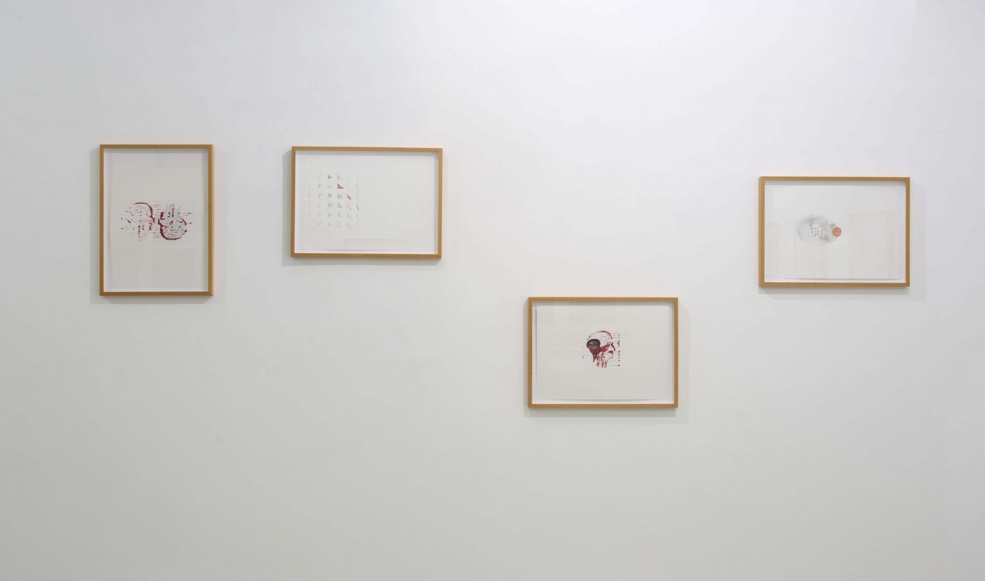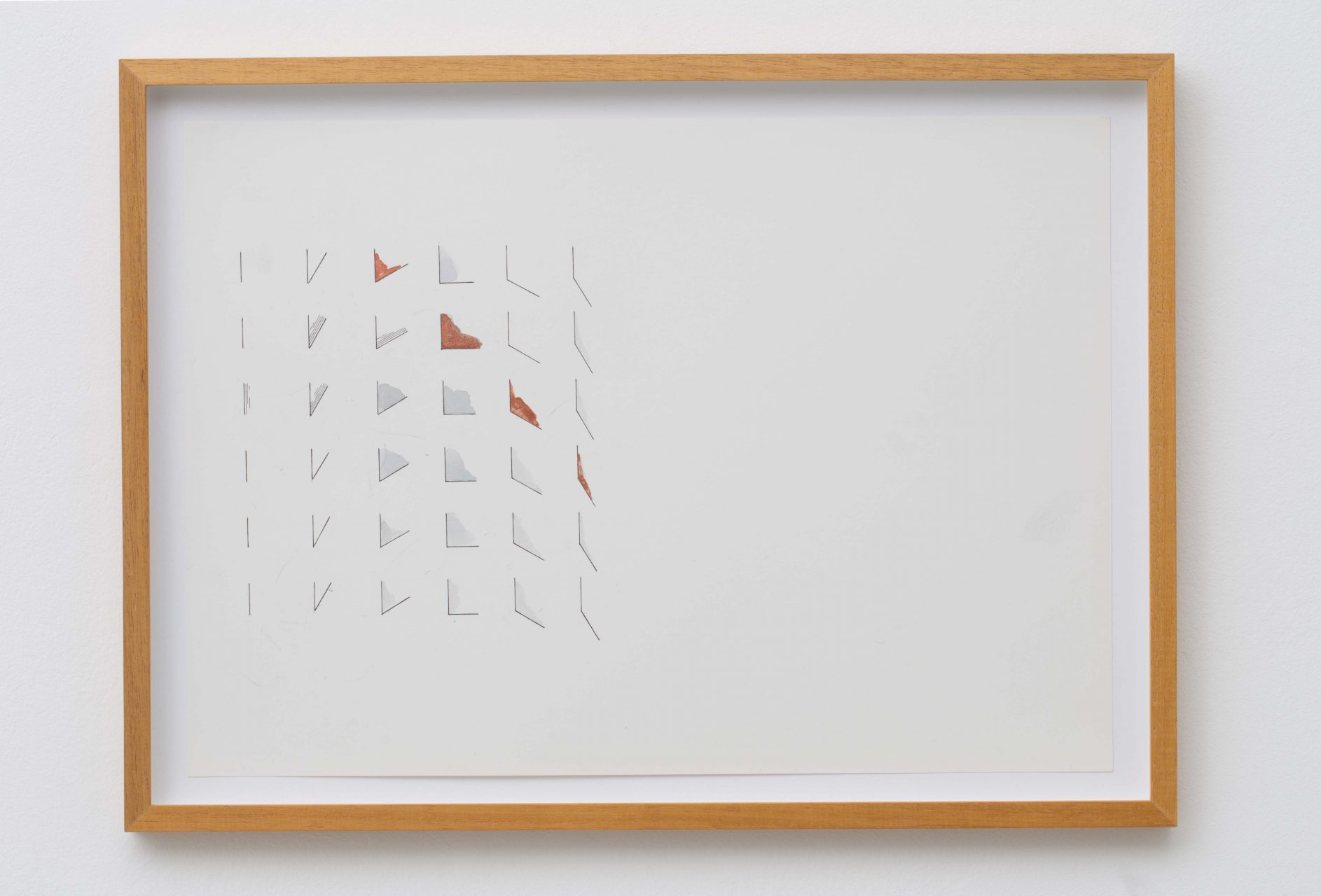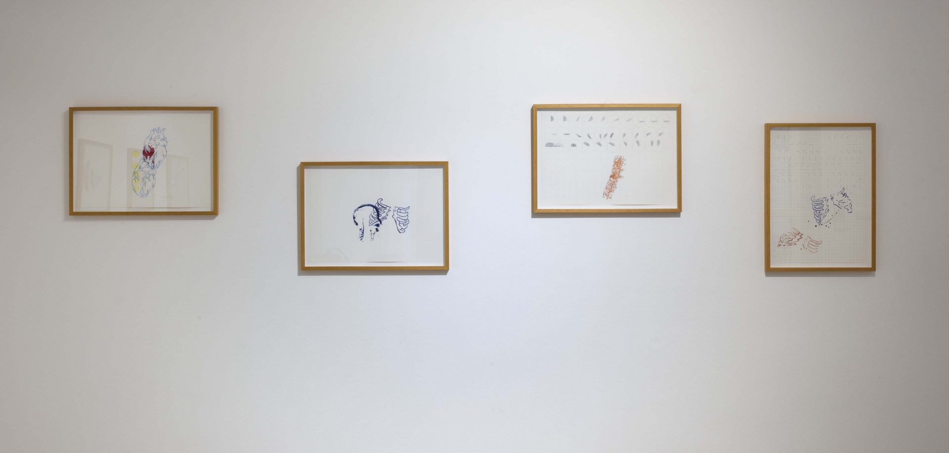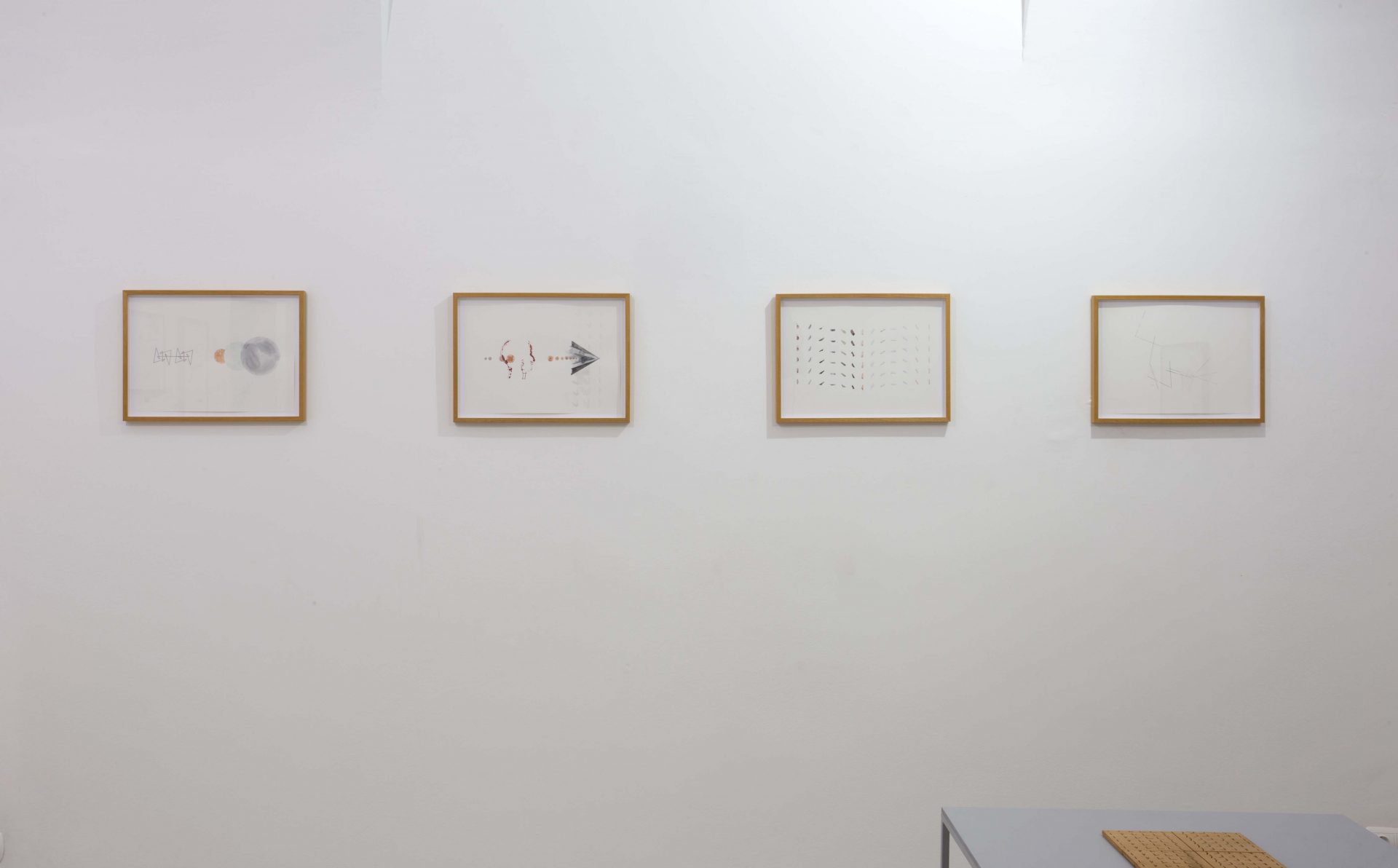 We perceive the passing of time through sequent events. Even if events around us follow each other inevitably, in our minds we can always stay in the past or in the future. But when are we in the present? Can the state of being present be perceived? The relationship of time and perception has been concerning Vécsei for a long time. In her drawing series entitled After Effect (2010) she explores the changing, unpredictable mechanism of remembrance. The material of the present exhibition is the continuation of the Timeline drawings (2016) displayed in Kisterem Gallery’s show Reality Exercises, in which the abstract forms around the horizontal axis refer to the phases of the clock-hand. The picture fields of the Presence series (2018) keep the horizontal axis but in the same time shift in a vertical direction. The clean forms known from earlier graphics – like the orb, the circle or the line – are completed with anatomical sectional drawings. In each drawing the luster-like, gleaming surfaces of Japanese pearlescent watercolor increase the possibility of tilting of the abstract and figural shapes of uncertain state. The horizontal, vertical, and diagonal lines create the reticular system that Vécsei spreads into space through the installations. The monotonous pattern of the wooden, plaster and silicon panels repeat the twelve phases of the clock-hand, advancing on the same track from line to line. The human body moves similarly to the clock-hand around its spine; it approaches the horizontal axis during the night and the vertical during the day. Although the units of the time net are constant, monotony gets broken: the here and there crackled design of the plaster-silicon installation (Fragment) turns from negative into positive, the wood piece’s (One Day) unity of twenty-four hours gets upset by its network organized into asymmetrical waves. Vécsei precisely depicts the relative nature of permanence, and by tackling time out of joint she makes hidden structures of presence visible.