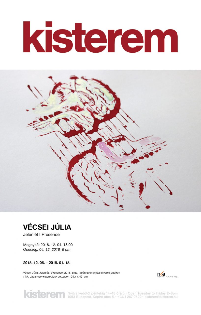 Az idő múlását egymást követő eseményeken keresztül érzékeljük. Ha a körülöttünk zajló események megállíthatatlanul követik is egymást, gondolatban még mindig lehetünk a múltban vagy éppen a jövőben. De mikor vagyunk a jelenben? Észlelhető-e egyáltalán a jelenlét állapota? Vécseit régóta foglalkoztatja az idő és az érzékelés kapcsolata. Utólagos c. rajzsorozatában (2010) az emlékezés változékony, kiszámíthatatlan mechanizmusait vizsgálta. Jelen kiállítás anyaga folytatása a Kisterem Realitás gyakorlatok c. kiállításán bemutatott Idővonal rajzoknak (2016), melyeken a vízszintes tengely köré szerveződő absztrakt formák az óramutató fázisait idézik. A Jelenlét sorozat (2018) képmezői a vízszintes tengely megtartása mellett függőleges irányba mozdulnak el. A korábbi grafikákról ismert letisztult formák – mint a gömb, a kör vagy a vonal – anatómiai keresztmetszetekkel egészülnek ki. Egy-egy rajzon a japán gyöngyház akvarell lazúros, fénnyel játszó felületei fokozzák a bizonytalan helyzetű absztrakt és figurális formák kibillenésének lehetőségét. A vízszintes, függőleges és átlós irányú vonalak összessége alkotja azt a hálós szerkezetet, amit Vécsei az installációkon keresztül kiterjeszt a térbe is. A fa-, gipsz- és szilikon lapok monoton mintázata az óramutató tizenkét fázisát ismétli, azonos nyomvonalon halad sorról sorra. Gerincoszlopa tengelye mentén az óramutatóéhoz hasonló pályán mozog az emberi test is; éjszaka a vízszintes-, nappal a függőleges tengelyhez közelít. Bár az időháló egységei változatlanok, a monotonitás mégis megtörik: a gipsz-szilikon installáció (Fragmentum) helyenként megrepedt mintázata negatívból pozitívba fordul, a fa munka (Egy nap) huszonnégy órányi egységét finoman megbontja szabálytalan hullámokba rendeződött erezete. Vécsei precízen ábrázolja az állandóság relatív természetét és a kizökkent idő megragadásával láthatóvá teszi a jelenlét rejtett struktúráit.