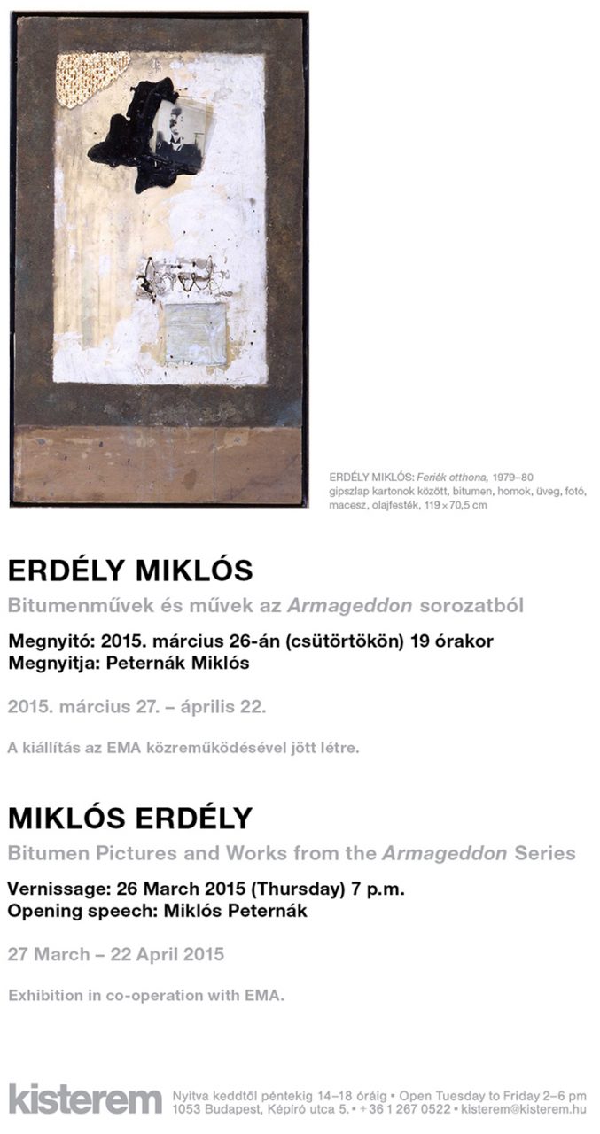 Erdély Miklós oeuvre-jében a Btm („bitumenmű”) kód alatt jelenleg negyven művet tartunk számon, amelyek 1979 és 1981 között készültek. A bitument bőségesen vagy nagyobb mennyiségben hordozó, tartalmazó bitumenképek mellett e csoportba tartoznak egyes, ebben az időszakban készített kollázsai is, amelyeken a bitumen csak részelem, vagy teljesen hiányzik, ám az anyaghasználat miatt mégis a bitumenképekkel hozhatók összefüggésbe. A bitumenművek között papír-, gipszkarton- és kátránypapír-alapú munkák egyaránt találhatók. A bitumenművek hasonló vagy azonos anyagokból állnak, mint az ebben az időben egy-egy alkalomra összeállított nagy méretű environmentek, mint például az 1980-as Südstrand (Wilhelmshaven), A kalcedoni zsinat emlékére (Bercsényi Kollégium), vagy az 1983-as Bitumentorta (Genova) és az 1984-es Hadititok (eredetileg: Bécs, jelenleg: KMM – Ludwig Múzeum Budapest). A kátránypapírt, a bitument, az üveget, a maceszt, vagy az indigópapírt Erdély gyakran használta, és az A kalcedoni zsinat emlékére című művéről tartott előadásában (Előadás a kiállításról) hosszabban beszélt anyagválasztásának okairól, illetve az egyes anyagok jelentéséről. Ugyanakkor nem könnyű feladat ebből az „anyag-ikonográfiából” kiindulva értelmezni az egyes bitumenműveket, amelyek egy részének a címét nem is ismerjük. A művek címének ismerete sem könnyíti meg azonban minden esetben a jelentéstulajdonítást – összetett anyag- és jelentésmontázsokról van szó, ahol „jelentéskioltással”, önmagáért való, érzéki anyag-tanulmánnyal, úgynevezett „Koll-montázs”-okkal, szándékos „art poverás” megoldásokkal, és filozofikus kor-reflexiókkal egyaránt találkozhatunk. A Kisteremben a kettes számú Bitumenkép mellett három bitumenmű látható. Az Acsás címében és a mű feliratában is olvasható kifejezés az „atomcsapásnak” a katonaságnál használt rövidítése, amelyet Erdély fia, Dániel révén ismert meg (a mű legutóbb, 2006-ban a Láthatatlan Atom című kiállításon szerepelt a Centrális Galériában). A Feriék otthona felirata az 1940-es évek egy emlékére nyúlik vissza, a „Feri-lét”-re, vagyis egy azonos nevű, állástalan szomszéd létmódjára, akinek az élete „maga volt a pokol”. Az Enyészpont elkoszolódott papírján grafitfirka, viasszal és bitumennel rögzített (kifeszített) spárga, fűszálak, és műanyag szám-applikáció látható. A számsor jelenléte miatt a mű Erdély nyolcvanas évekbeli „számos” vagy „matematikai” festményeivel is összefüggésbe hozható, amelyeken az „1” (egy) gyakran előfordul különböző formációkban. Az Enyészpont esetében az egyesek között kisebb vonalak, majd – jobb felé haladva – fordított vesszők találhatók, végül egy kettes és egy hármas (utóbbi egy „ponttal” félig-meddig nyolcassá téve), a legvégén pedig három lebegő vessző. A számsor végtelenbe futó törtként is értelmezhető, amely a spárgával jelzett horizontvonalon helyezkedik el. Az Enyészpont tehát egyfajta tájkép, amelyen perspektivikus ábrázolásból jól ismert enyészpont (illetve enyészpontok) konkrét anyagok formájában, tájépítő elemként vannak jelen. A matematikai-geometriai jelek („elvontság”) és a képalkotó anyagok hasonló jellegű kombinációja Erdély műveinek egyik fontos jellemvonása a nyolcvanas években.