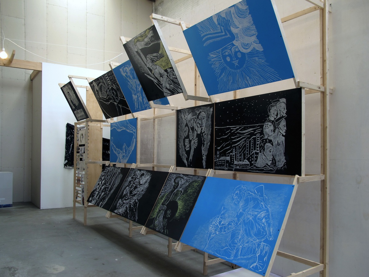 wooden structure, black-boards, chalk, paper work, 3x5x1 m